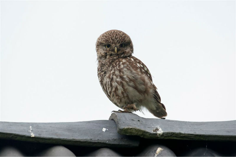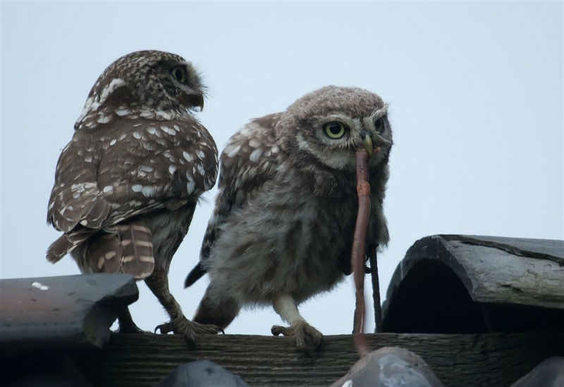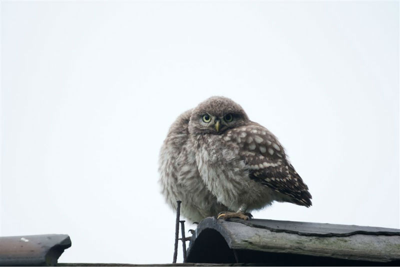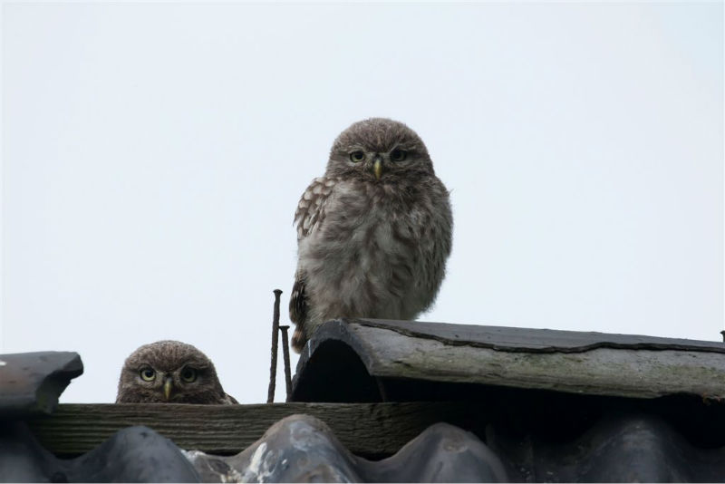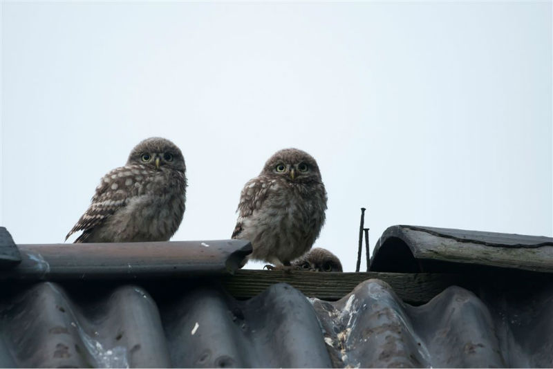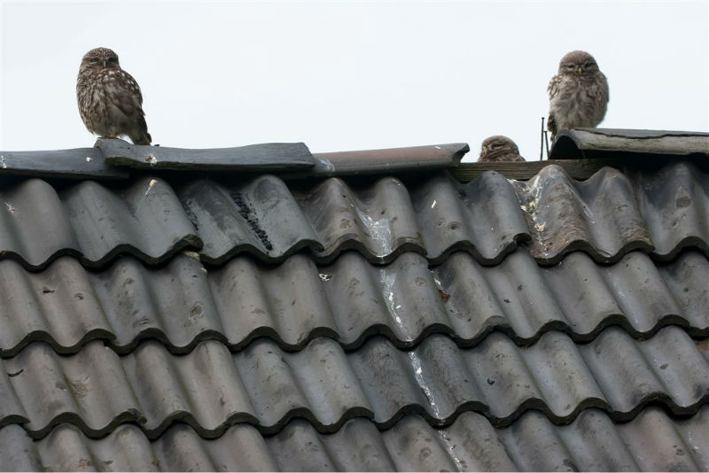 De camera gericht op de nok van het schuurtje waar, zo was de verwachting, vijf jongen door een ontbrekende pan naar boven zouden komen om op de nok uit te kijken naar pa en ma met voer. En het gebeurde nog ook! Het weer werkte redelijk mee, maar de lichtomstandigheden hadden wat beter gekund. André heeft desondanks prachtige foto's gemaakt.