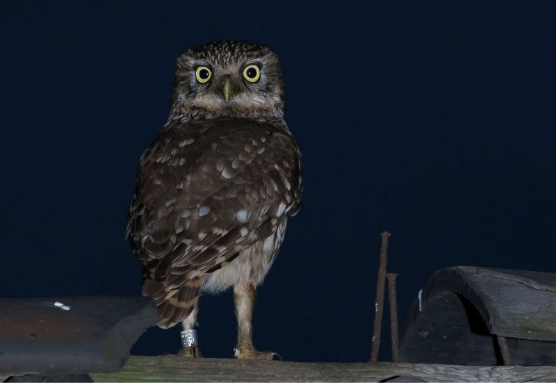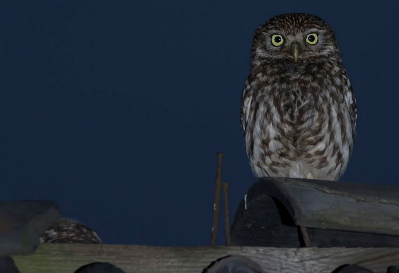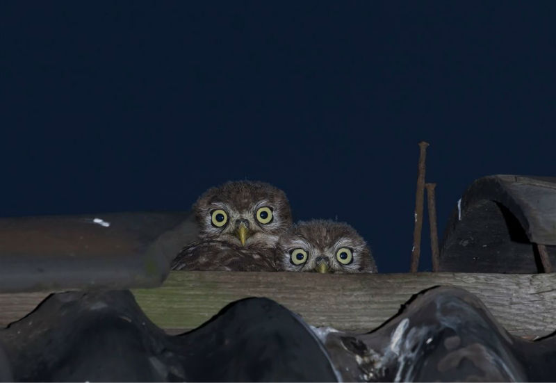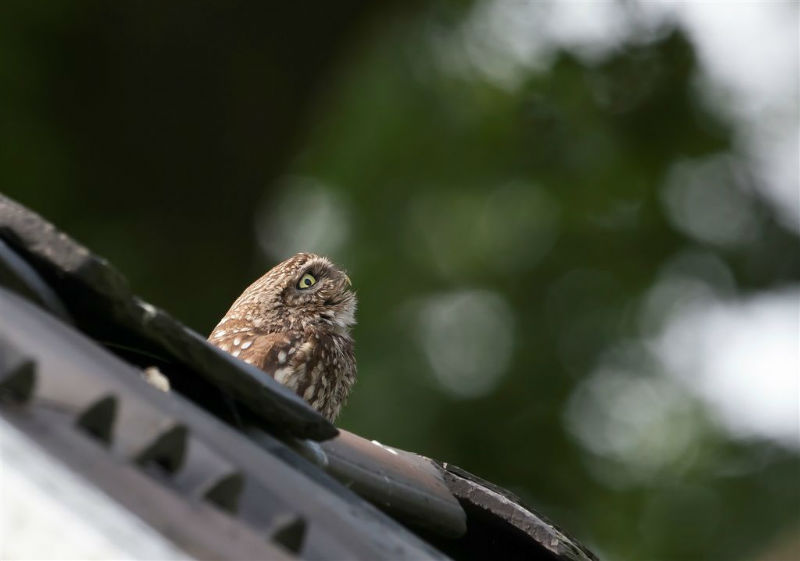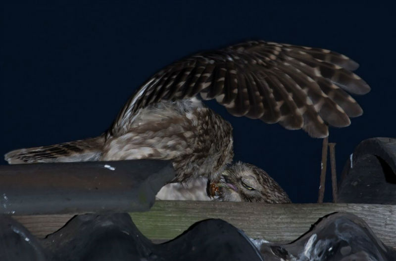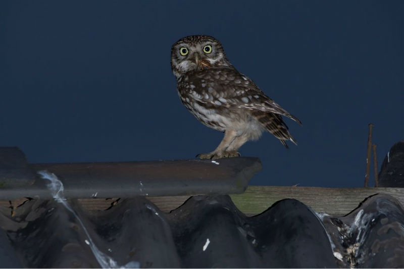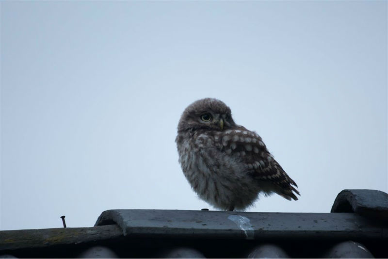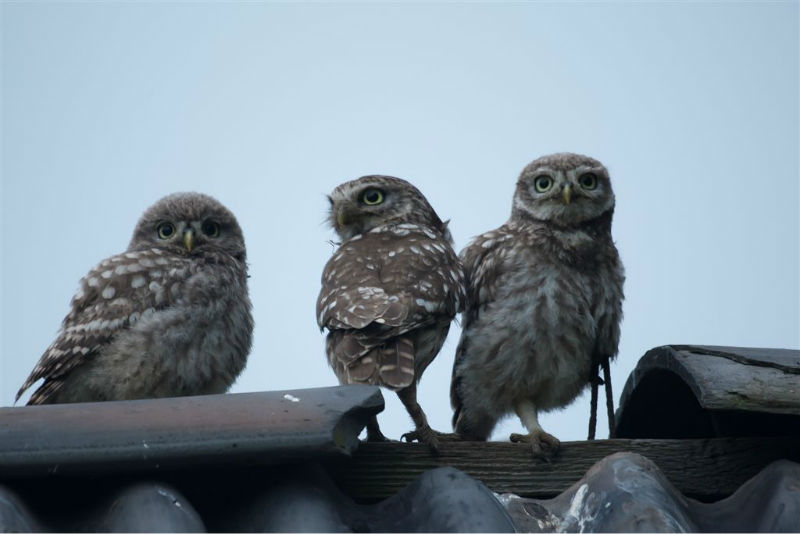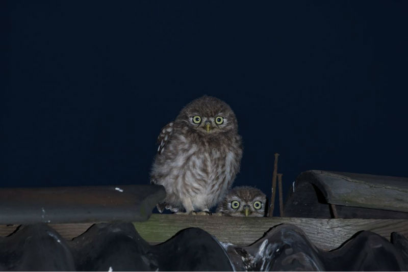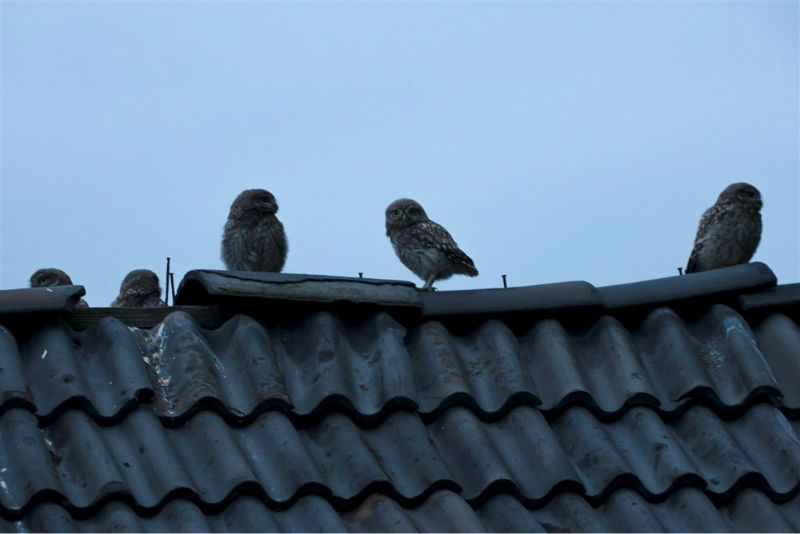 De jongen waren 42 dagen oud en we hadden verwacht dat ze wat langer op het dak zouden blijven zitten. Ze konden echter al heel aardig vliegen en verdwenen dan voor ons gevoel veel te snel in de hoge eiken langs de kant van de weg. Het grootste deel van de nacht waren ze met pa en ma op stap, de omgeving aan het verkennen. Pas tegen de vroege ochtend keerde de hele familie terug. Het vijftal schoot snel door het gat het zoldertje. Pa en ma lieten zich nog goed bekijken. Ook van hen prachtige foto's. Die met het ringetje om is het vrouwtje, het mannetje is niet geringd.