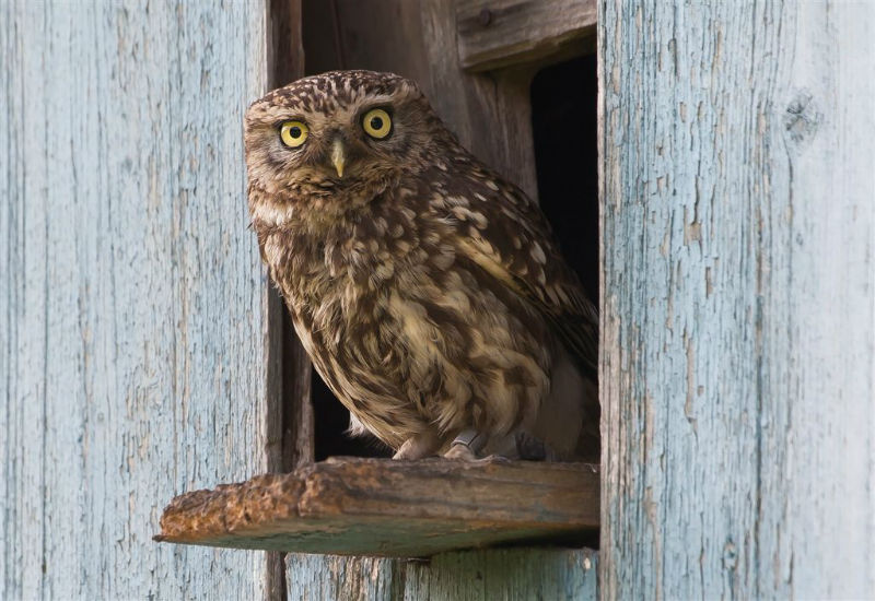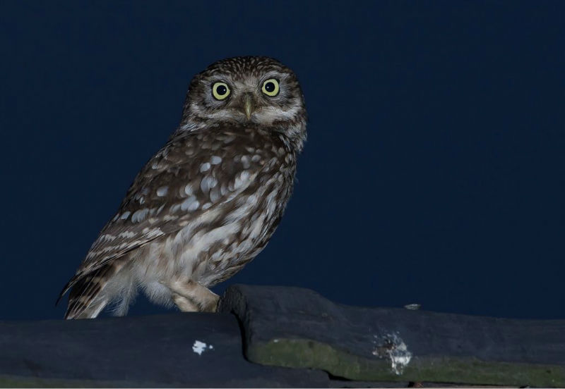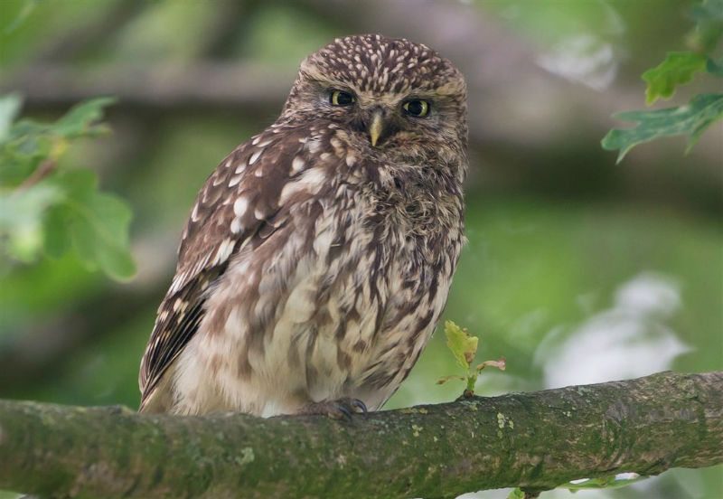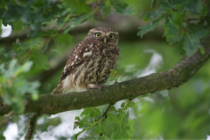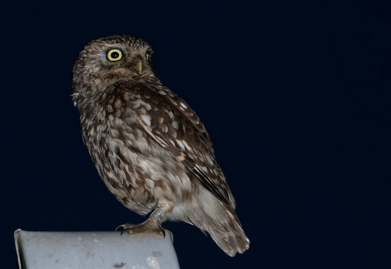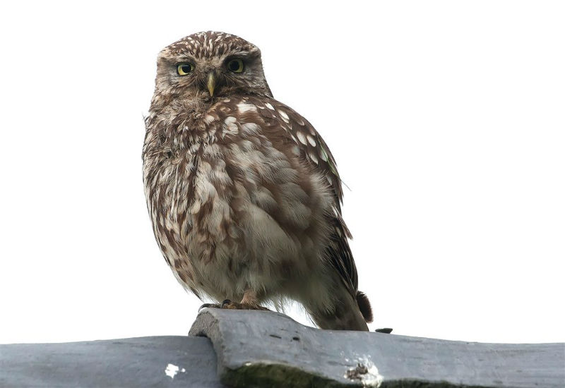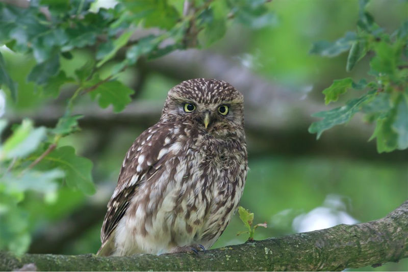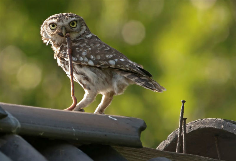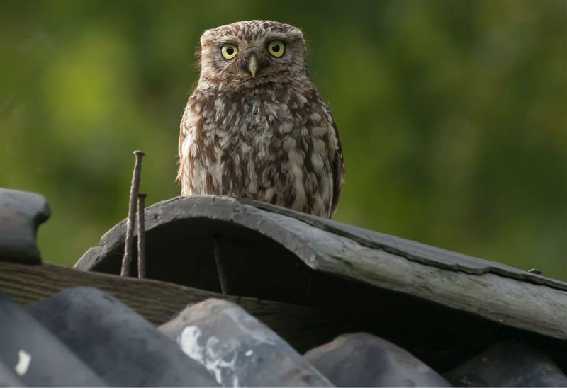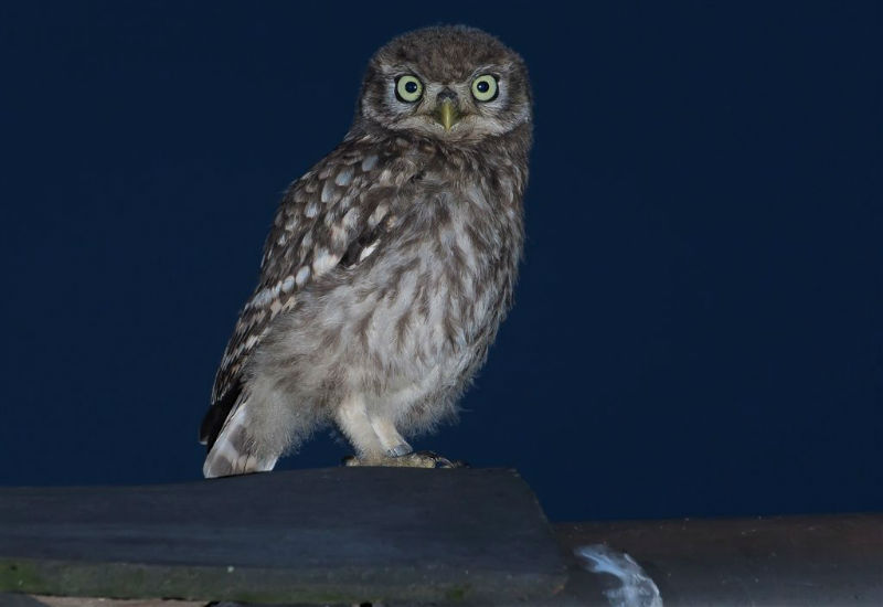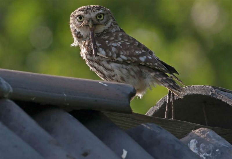 De jongen waren 42 dagen oud en we hadden verwacht dat ze wat langer op het dak zouden blijven zitten. Ze konden echter al heel aardig vliegen en verdwenen dan voor ons gevoel veel te snel in de hoge eiken langs de kant van de weg. Het grootste deel van de nacht waren ze met pa en ma op stap, de omgeving aan het verkennen. Pas tegen de vroege ochtend keerde de hele familie terug. Het vijftal schoot snel door het gat het zoldertje. Pa en ma lieten zich nog goed bekijken. Ook van hen prachtige foto's. Die met het ringetje om is het vrouwtje, het mannetje is niet geringd.