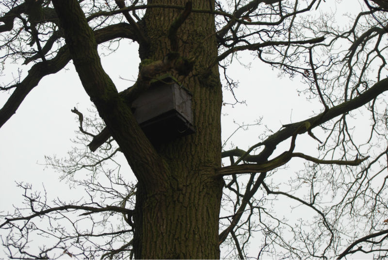 ... Steenmarter zijn? Voorzichtig de deksel gelicht en warempel ... een Steenmarter. Het arme beest schrok uiteraard van de vreemde bezoekers, maar wist toch zijn tegenwoordigheid van geest te bewaren. Voor we het goed en wel in de gaten hadden had hij de doek uit de invliegopening getrokken en landde hij met een ferme sprong een meter voor Pascal op de grond. In plaats van zich als een haas uit de voeten te maken klom hij de nevenstaande boom in. In het topje daarvan draaide hij zich en staarde ons aan: "Kom me hier maar eens halen als jullie durven!"Nou, dat durfden we niet, maar we kregen wel een prima gelegenheid hem te bewonderen en te fotograferen. Helaas was de boom erg hoog en het (tegen) licht door de mist erg slecht, maar ... oordeel zelf.